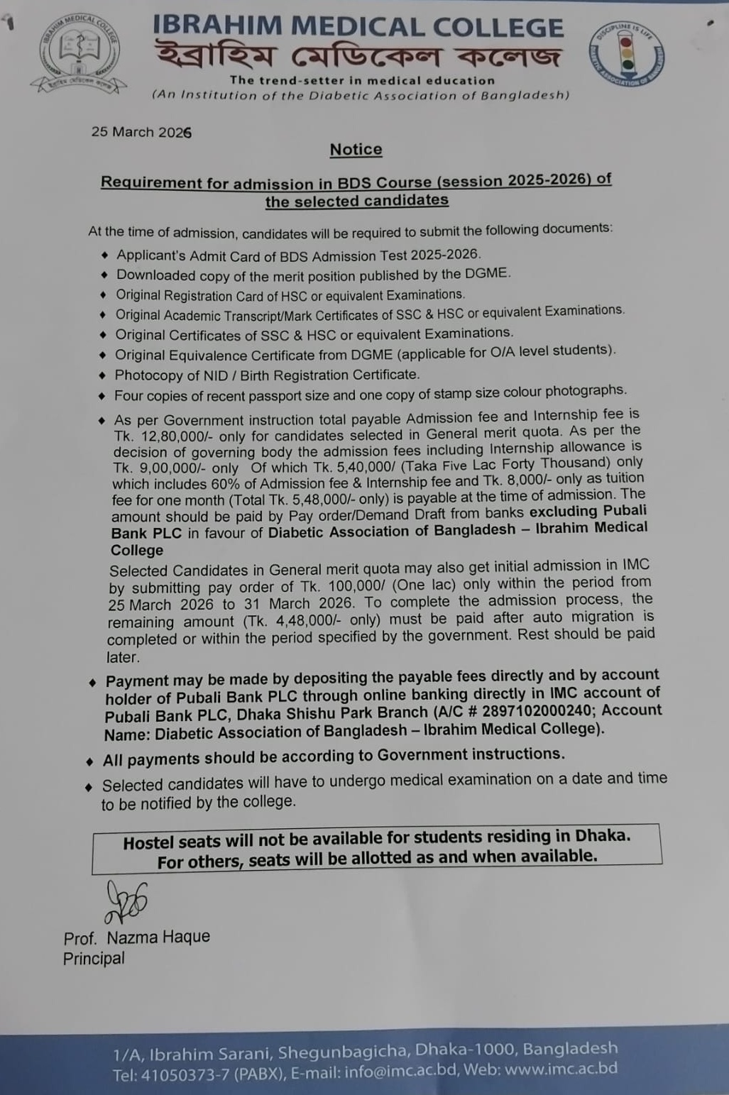 Notice: Requirement for Admission in BDS Course (Session 2025-2026) of the selected candidates