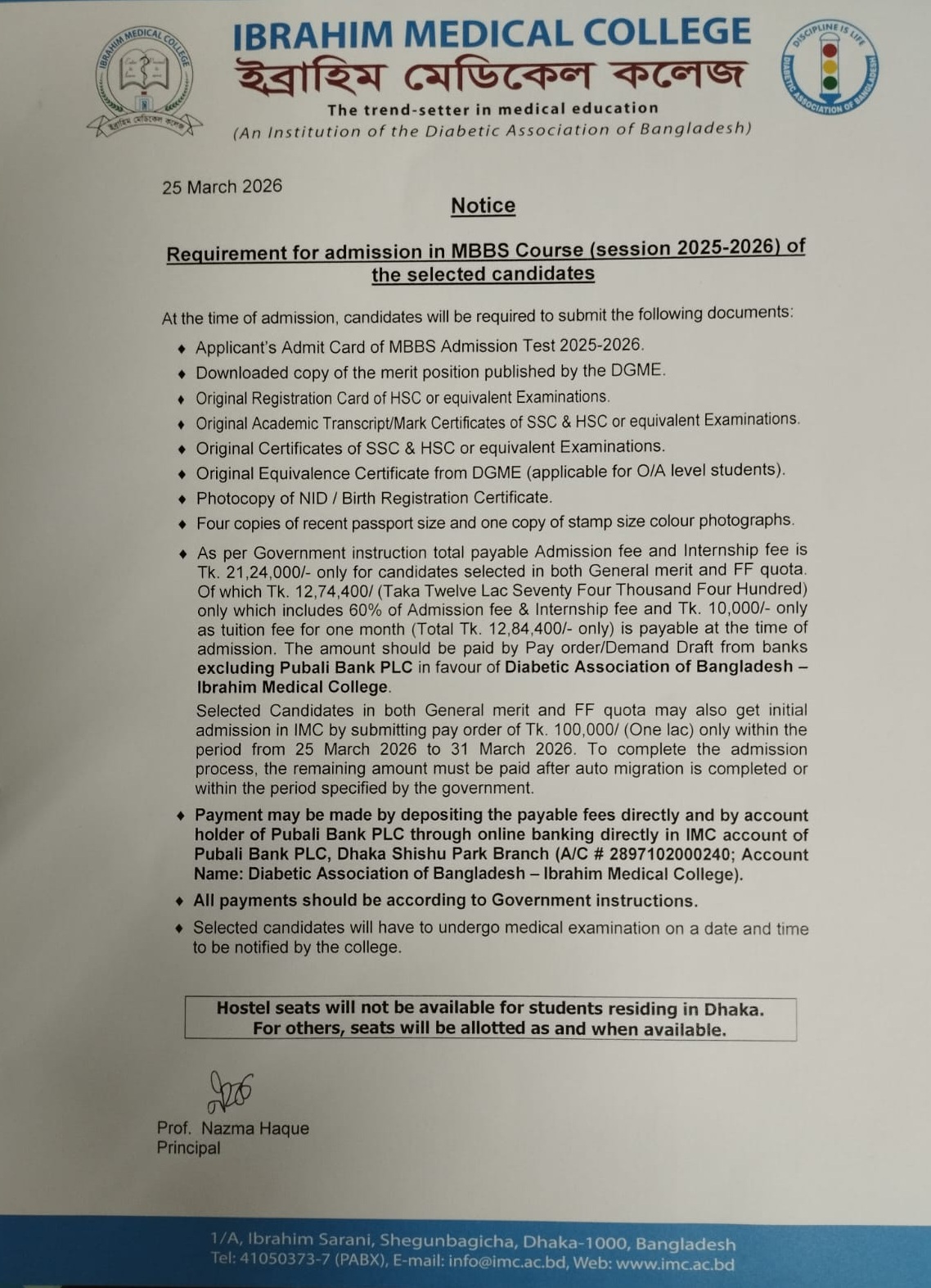 Notice: Requirement for Admission in MBBS Course (Session 2025-2026) of the selected candidates