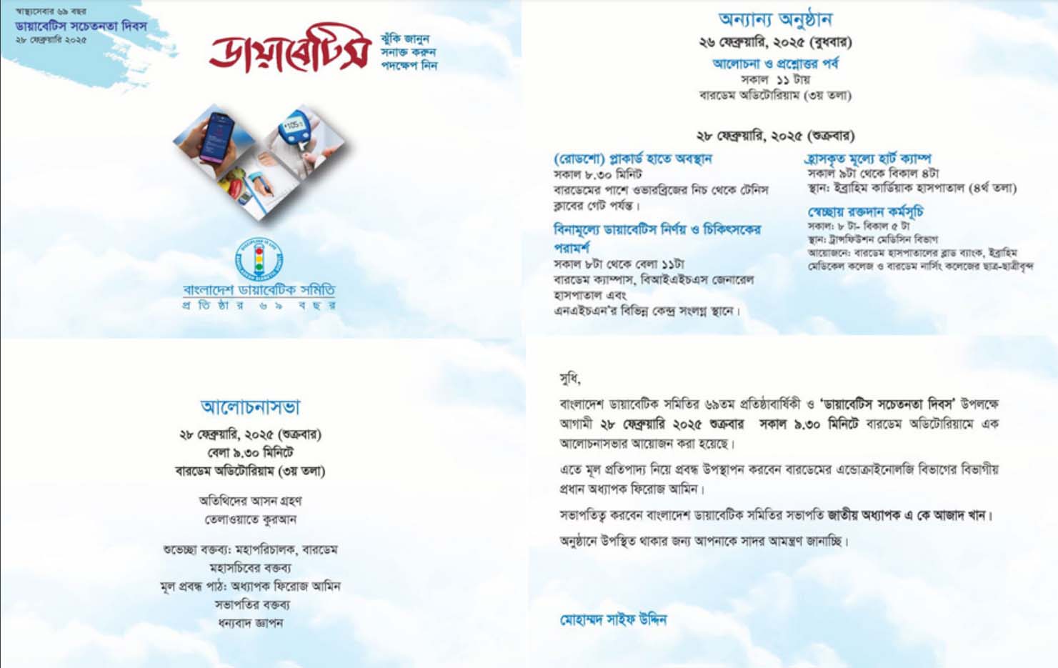 ডায়াবেটিস সচেতনতা দিবস- আলোচনা সভা। বারডেম অডিটরিয়াম (৩য় তলা)।